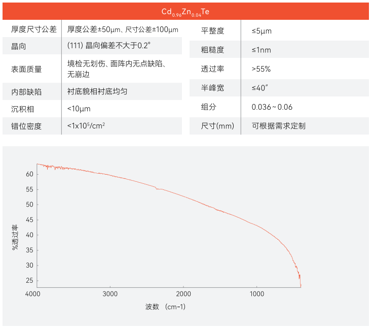碲鋅鎘單晶(Cd1-xZnxTe,CZT)為寬禁帶II-VI族化合物半導體,可以看作是CdTe和ZnTe固溶而成,常溫常壓下為閃鋅礦結構,屬于立方晶系。其熔點根據Zn含量不同,在1092°C~1295°C之間變化。其晶格常數可以通過改變Zn組分加以調制,能夠和窄禁帶的HgCdTe材料在晶格上實現完全匹配,因此可作為HgCdTe外延的優選襯底材料,已被廣泛應用于制備高性能紅外焦平面探測器。