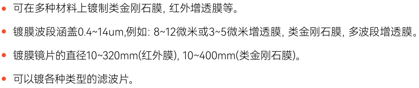 光智科技擁有成熟的鍍膜技術,可生產各種類型紅外膜:AR膜提高鏡片紅外光譜透過率,提高光學成像效果;HD膜提高鏡片耐摩擦能力,增強使用壽命;DLC膜提高鏡片硬度、耐腐蝕等能力;HR膜提高鏡片超高反射率;IR膜獲得不同光譜波段截止透過效果。